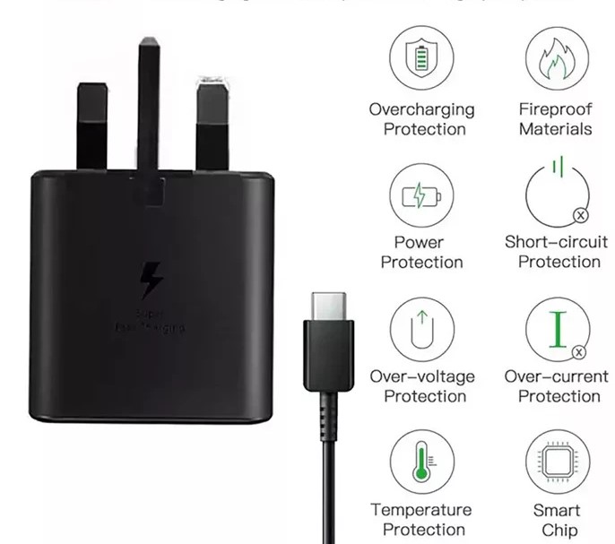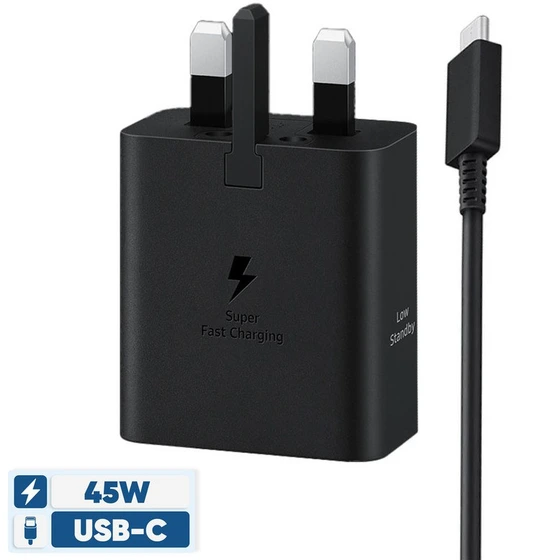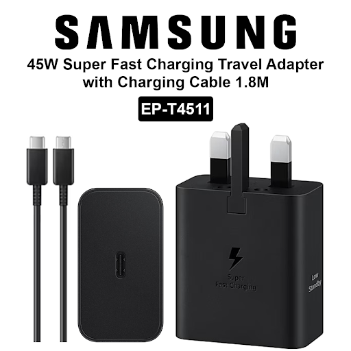 شارژر اصلی سه پین 45 وات مدل T4511 سامسونگ به همراه کابل اصلی و 1.8 متری، این شارژر به عنوان شارژر دیواری نیز شناخته می شود.